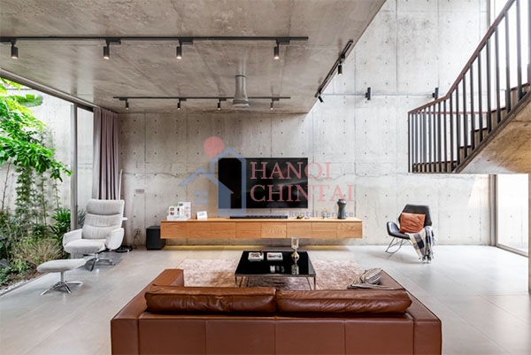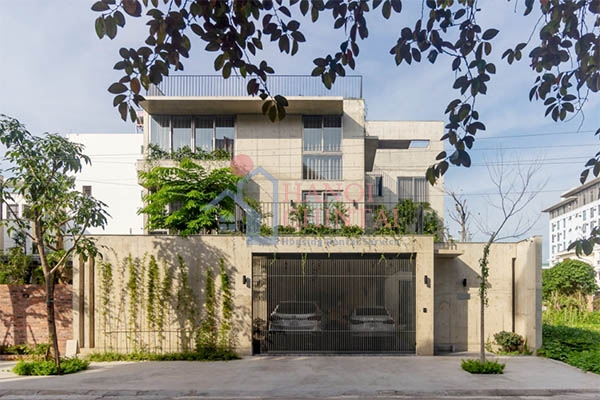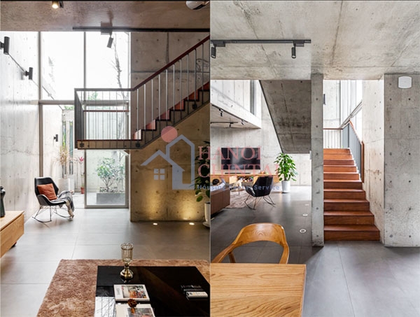 Vật liệu chủ đạo làm nên kiến trúc ngôi nhà độc đáo này là bê tông trần, một loại vật liệu khá phổ biến trên thế giới nhưng vẫn còn khá lạ với Việt Nam với ưu điểm bền vững với thời gian và mang lại cảm giác dễ chịu phù hợp điều kiện khí hậu nhiệt đới tại Việt Nam.