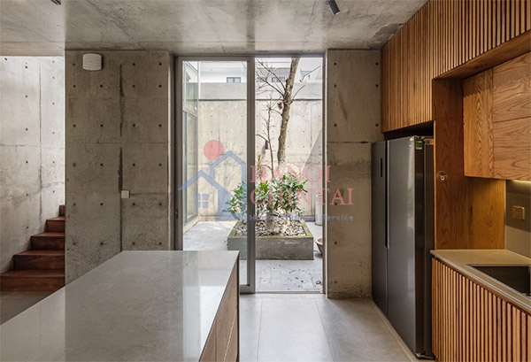 Bếp chính hình chữ I thiết kế mở trên chất liệu gỗ tone sur tone với cầu thang, đồ nội thất trong nhà.