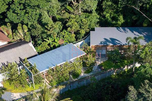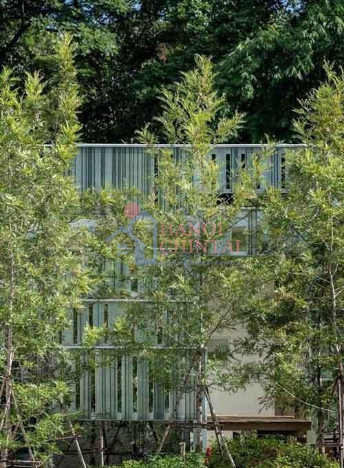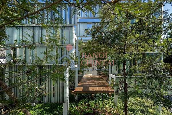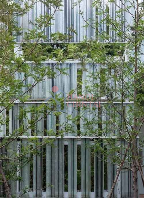 Cây xanh bao quanh ngôi nhà, tạo nên một bức tường xanh mát mắt.