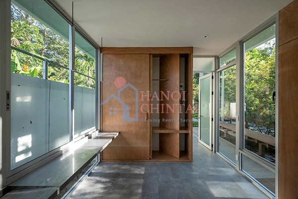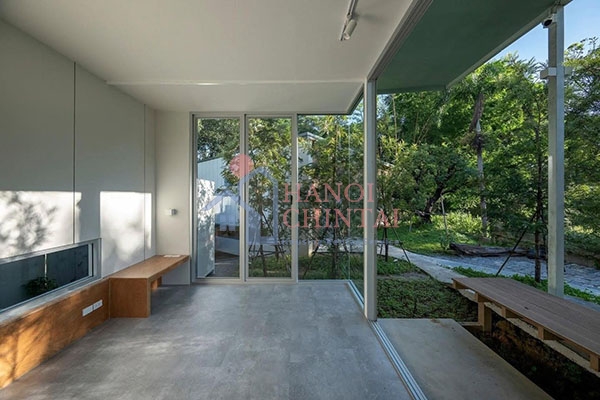 Ngôi nhà vườn phải chịu ánh nắng hướng Tây, đây là điều không ai mong muốn. Tuy nhiên, vấn đề này đã được nhà thiết kế nghiên cứu và đưa ra phương án sử dụng kính Low-E. Loại kính này được phủ hợp chất chuyên dụng giúp làm chậm quá trình hấp thụ nhiệt.