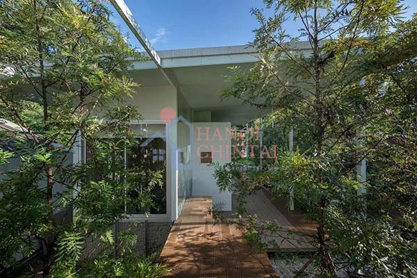 Cây xanh được trồng xung quanh ngôi nhà, tạo nên một không gian xanh mát và trong lành. Sân gỗ mang đến sự mộc mạc, thân thiện và hài hòa với màu xanh của cây lá.