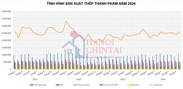 Lũy kế 10 tháng đầu năm 2024, sản xuất thép thô của cả nước đạt hơn 18 triệu tấn, tăng 16% so với cùng kỳ năm 2023.Sản xuất thép thành phẩm các loại đạt 24,5 triệu tấn, tăng 8,5% so với cùng kỳ. Trong đó, sản xuất thép tôn mạ kim loại & sơn phủ màu đạt cao nhất là 27,1%, thép xây dựng tăng 12,2% và ống thép tăng 4,6% và HRC là 3,2%; sản xuất Thép cuộn cán nguội ghi nhận mức tăng trưởng âm là 16,2%.