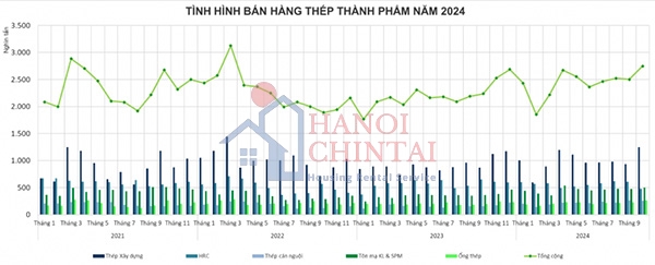 Trong khi đó, bán hàng thép thành phẩm trong tháng 10/2024 vừa qua đạt 2,7 triệu tấn, cao hơn 9,4% so với tháng 9 và tăng 22,5% so với cùng kỳ năm ngoái. Tăng trưởng đến từ thép xây dựng, ống thép, tôn mạ kim loại và SPM. Sự khởi sắc chủ yếu đến từ thị trường nội địa khi xuất khẩu vẫn đi lùi.