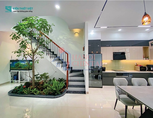 Mảng xanh chuyển tiếp giữa không gian phòng khách và phòng bếp