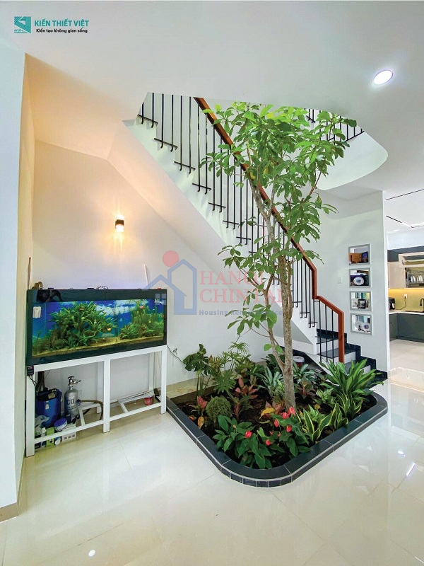 Khu vực tiểu cảnh và hồ cá thủy sinh bên dưới giếng trời, tạo nên một hệ sinh thái cho ngôi nhà thêm thông thoáng và gần gũi thiên nhiên.