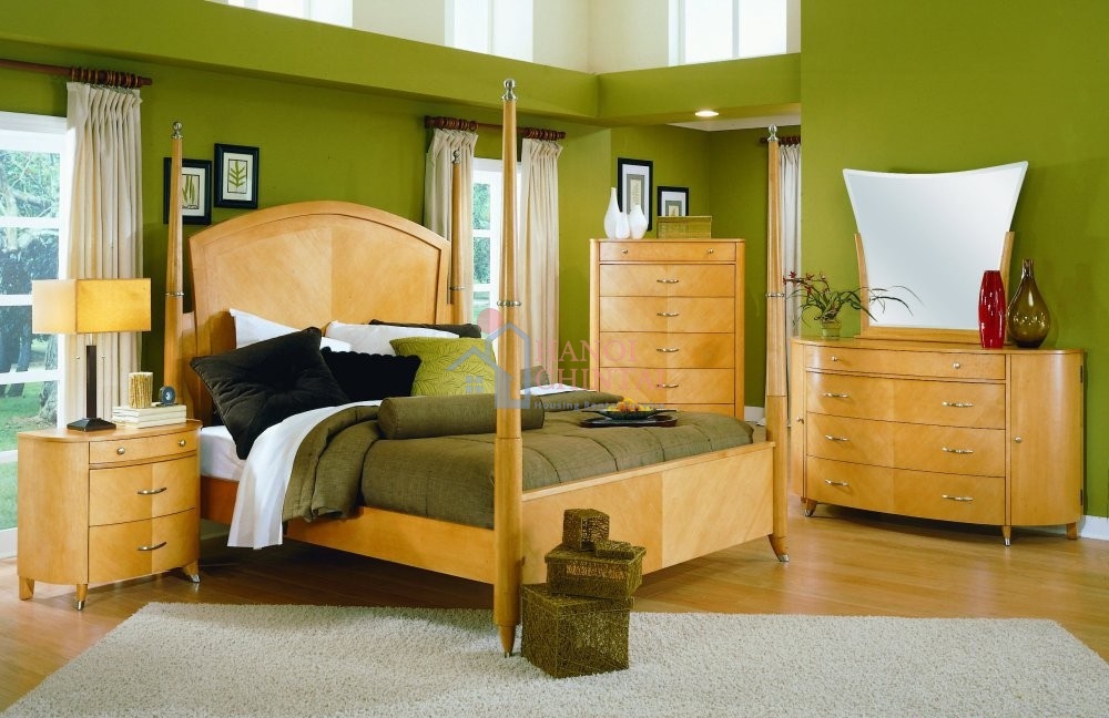 Màu xanh lá kết hợp hài hoà với nội thất gỗ trong phòng ngủ.