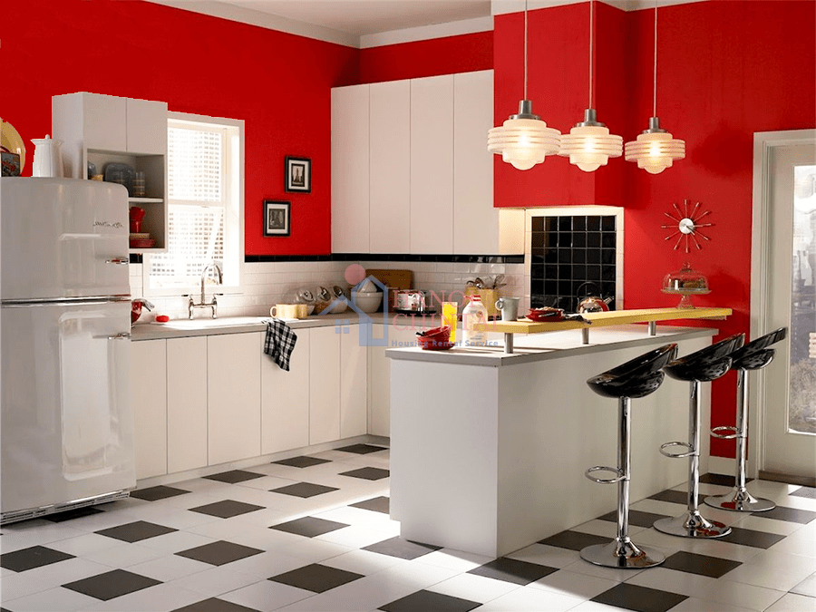 Nội thất trắng nhẹ nhàng nổi bật với tường sơn đỏ rực rỡ.