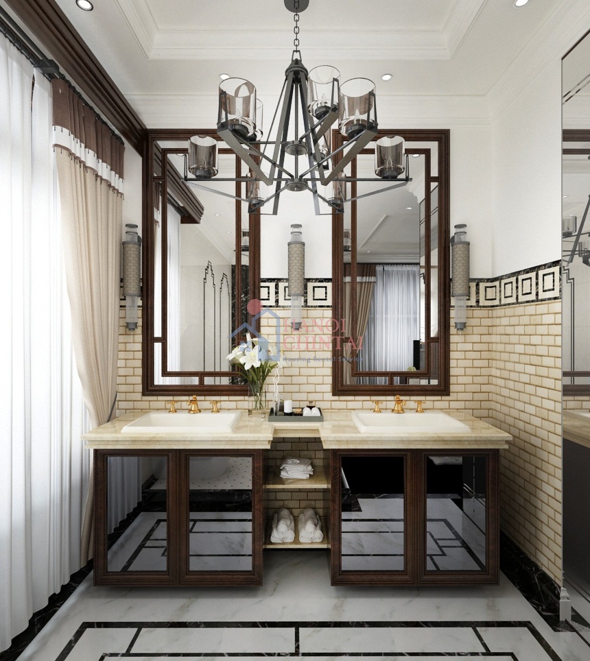 Với một diện tích phòng tắm nhỏ hơn và kinh phí tiết kiệm, sàn gỗ là vật liệu nên được cân nhắc. Rất nhiều loại gỗ công nghiệp chống thấm cao cấp có khả năng chịu độ ẩm cao cũng như chống trơn trượt tốt đang được cung cấp trên thị trường. Ngoài ra, sắc vàng tự nhiên sẽ rất hợp với các gia chủ yêu thích phong cách cổ điển, nhẹ nhàng.