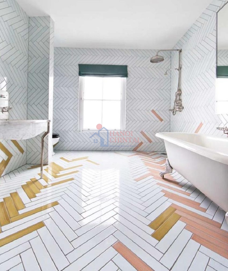 Bạn cũng có thể phá vỡ sự đơn điệu cho phòng tắm sàn màu trắng với cách đơn giản là chọn một số gạch có màu sắc sinh động và lát chúng theo hình xương cá.