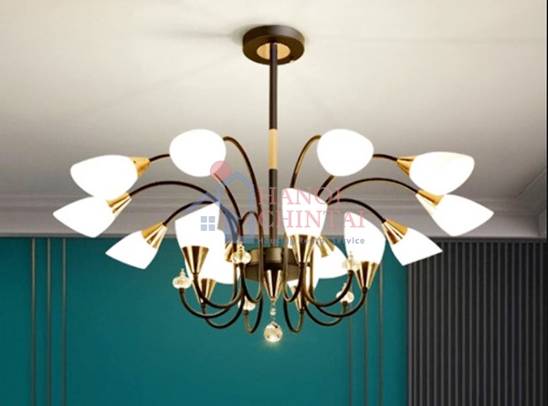 + Phòng khách: Thường phòng khách sẽ sử dụng đèn led để chiếu sáng; đèn chùm và đèn thả tạo điểm nhấn cho không gian thêm ấm cúng, gần gũi.