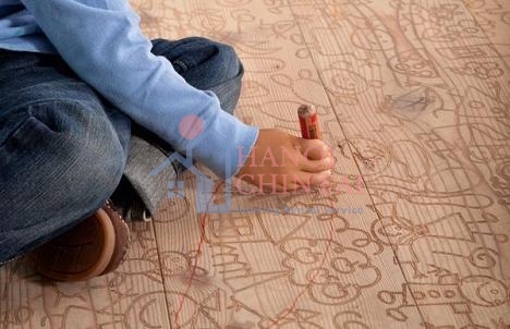 Thay vì những sàn gỗ trơn thông thường, bạn hãy thử thay đổi bằng sàn gỗ được khắc các họa tiết đấy tính nghệ thuật và ngẫu hứng. Những hoa văn nghệ thuật độc đáo sẽ tạo điểm nhấn thú vị hoặc những họa tiết ngộ nghĩnh sẽ giúp trí tưởng tượng của con bạn thêm phong phú.