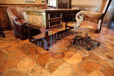 Các lát cắt thân cây với nhiều vân gỗ sau khi được gia công đã trở nên bắt mắt như những viên đá cẩm thạch. Đây là thiết kế sàn nhà vô cùng tỉ mỉ và nghệ thuật, phù hợp với những căn phòng được thiết kế đơn giản.