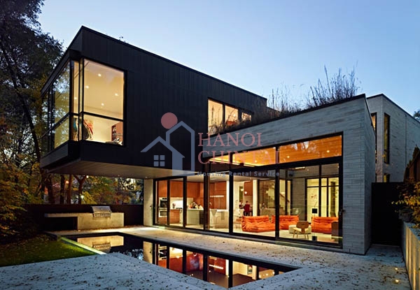 Các kiến trúc sư đã xây dựng một tòa nhà trên diện tích rộng 1.700 feet vuông. Hai khối kiến trúc khổng lồ với màu gỗ chủ đạo tương ứng với 2 tầng của tòa nhà. Đường nét tối giản, kết hợp giữa đường thẳng và những hình khối đặc biệt khiến cho tòa nhà càng trở nên ấn tượng. Tầng 2 của ngôi nhà được lắp đặt một dạng cửa chớp cho phép chủ nhà có thể nhìn ra ngoài nhưng người bên ngoài không thể nhìn vào trong. Ngôi nhà không chỉ truyền tải được tinh thần của phong cách kiến trúc đương đại mà còn vượt ra khỏi những hình dung thông thường về một tòa nhà 2 tầng.