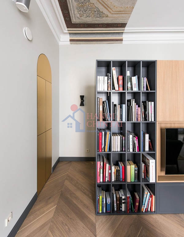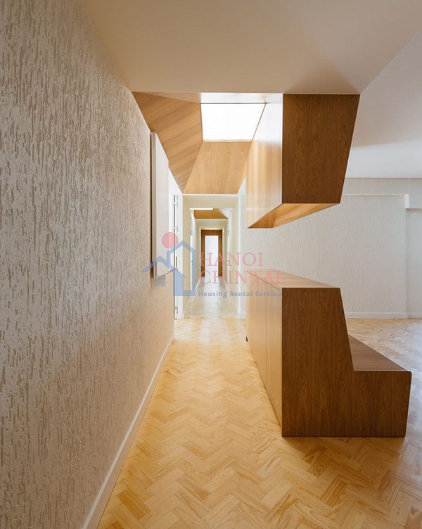 Ngôi nhà được thiết kế bằng cách sử dụng sàn lát gỗ có hoa văn xương cá màu nhạt, và tấm ốp màu vàng tạo khung cửa sổ trần trên trần nhà. Gỗ và đá cẩm thạch được sắp xếp theo mô hình xương cá để xác định các khu vực và không gian khác nhau của căn hộ.