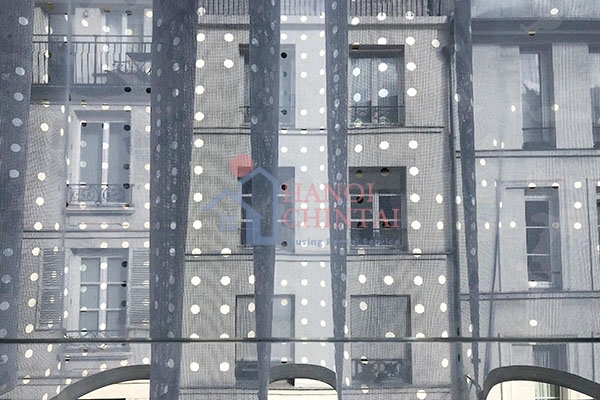 Vật liệu che mặt tiền được bố trí như một tấm rèm khổng lồ vừa chống nóng vừa có tác dụng trang trí.
