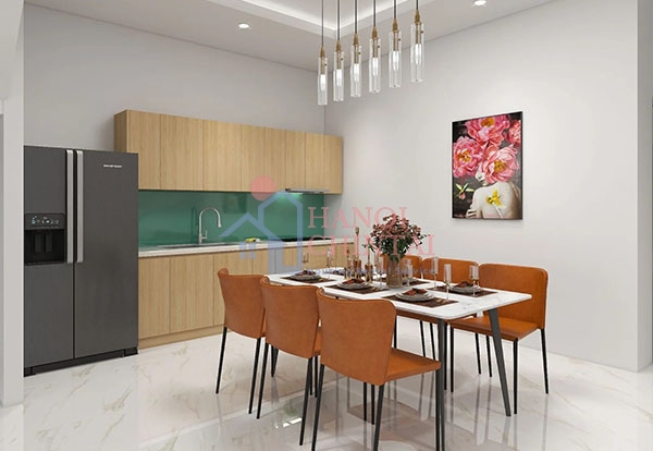 Phòng bếp xây dựng từ nhiều loại vật liệu nội thất mới.