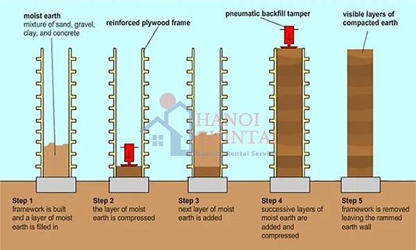 Tường đất nện được đúc sẵn bằng cách lấp đầy khung có sẵn bằng một lớp đất ẩm bao gồm cát, sỏi, đất sét và chất ổn định. Lớp này sau đó được nén còn 50% thể tích ban đầu của nó. Toàn bộ quá trình được lặp đi lặp lại để lấp đầy dần khung, sau đó khung được loại bỏ, để lại bức tường đất nện.