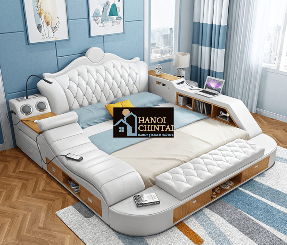 Giường ngủ tích hợp với bàn máy tính, thiết bị âm thanh và bộ bàn ghế giải trí ngay bên cạnh.