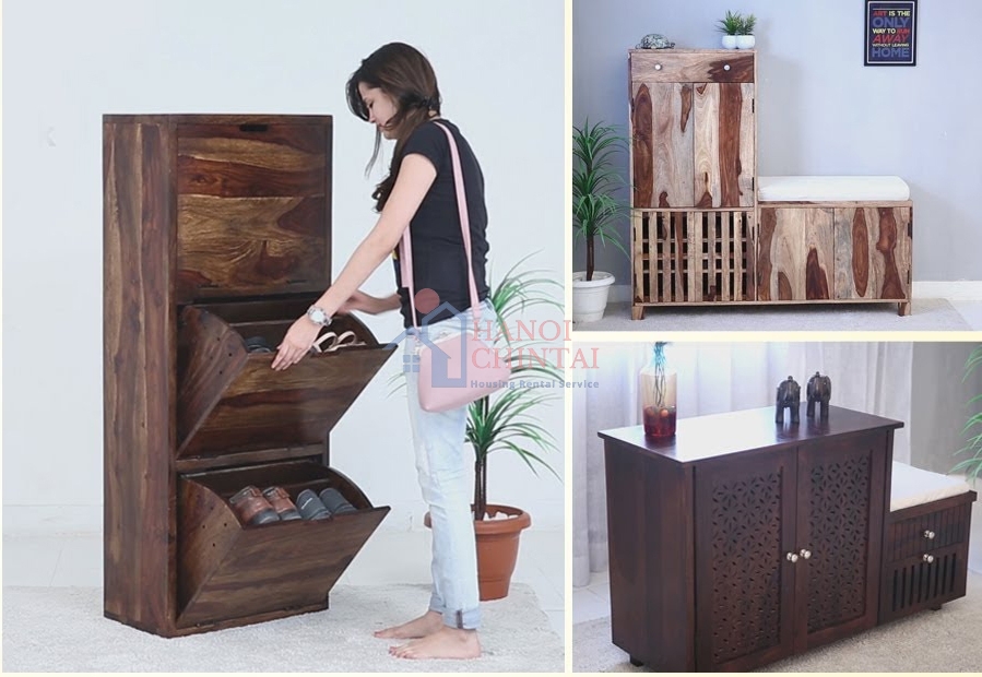 Chiếc tủ giày làm bằng gỗ tự nhiên có thiết kế khe thoáng khí giữ cho giày luôn khô ráo và sạch sẽ.