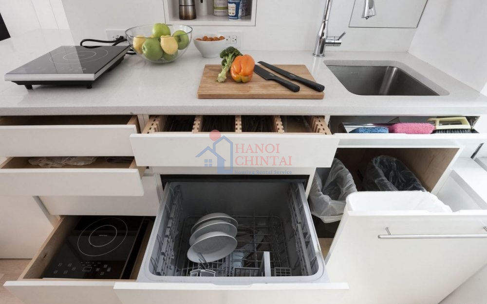 Tủ bếp tích hợp kệ để đồ tiện dụng.