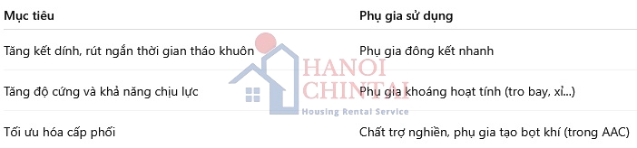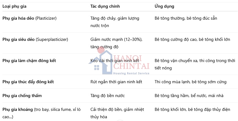 Dưới đây là phân loại và ứng dụng chính của các loại phụ gia dùng cho vật liệu xây dựng: