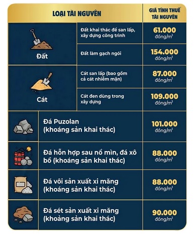 Đối với nhóm đất và cát phục vụ san lấp, xây dựng công trình, đất khai thác để san lấp, xây dựng công trình có giá tính thuế 61.000 đồng/m³; đất làm gạch, ngói được áp dụng mức 154.000 đồng/m³. Cát san lấp, bao gồm cả cát nhiễm mặn, có giá tính thuế 87.000 đồng/m³; cát đen dùng trong xây dựng được xác định ở mức 109.000 đồng/m³.