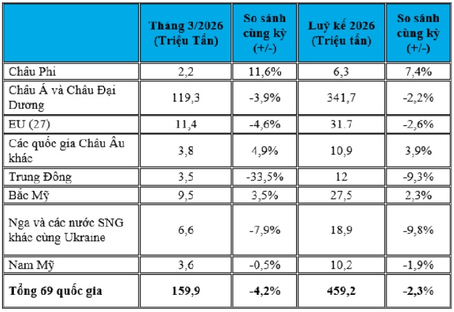 Châu Phi sản xuất 2,2 triệu tấn trong tháng 3/2026, tăng 11,6% so với tháng 3/2025. Khu vực châu Á và châu Đại Dương đạt 119,3 triệu tấn, giảm 3,9%. Liên minh châu Âu (EU-27) sản xuất 11,4 triệu tấn, giảm 4,6%. Các nước châu Âu khác đạt 3,8 triệu tấn, tăng 4,9%. Trung Đông sản xuất 3,5 triệu tấn, giảm mạnh 33,5%. Bắc Mỹ đạt 9,5 triệu tấn, tăng 3,5%. Nga và các nước SNG khác cùng Ukraine đạt 6,6 triệu tấn, giảm 7,9%. Nam Mỹ sản xuất 3,6 triệu tấn, giảm 0,5%.