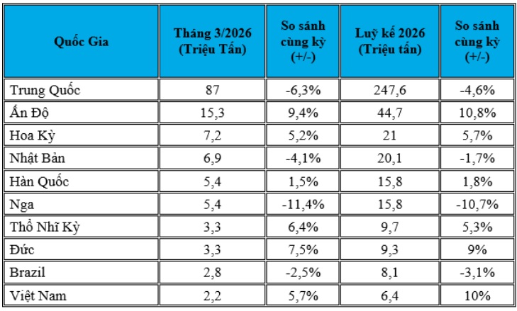 Ấn Độ tiếp tục là điểm sáng trong chú ý trong thị trường thép toàn cầu. Trong tháng 3/2026, sản lượng thép thô của Ấn Độ đạt 15,3 triệu tấn, tăng mạnh 9,4%, trong khi Hoa Kỳ sản xuất 7,2 triệu tấn, tăng 5,2%. Nhật Bản ghi nhận 6,9 triệu tấn, giảm 4,1%, còn Nga ước tính đạt 5,4 triệu tấn, giảm 11,4%. Hàn Quốc cũng sản xuất 5,4 triệu tấn, tăng nhẹ 1,5%. Thổ Nhĩ Kỳ và Đức cùng đạt 3,3 triệu tấn, lần lượt tăng 6,4% và 7,5%. Brazil sản xuất 2,8 triệu tấn, giảm 2,5%, trong khi Việt Nam ước tính đạt 2,2 triệu tấn, tăng 5,7% so với cùng kỳ.