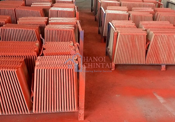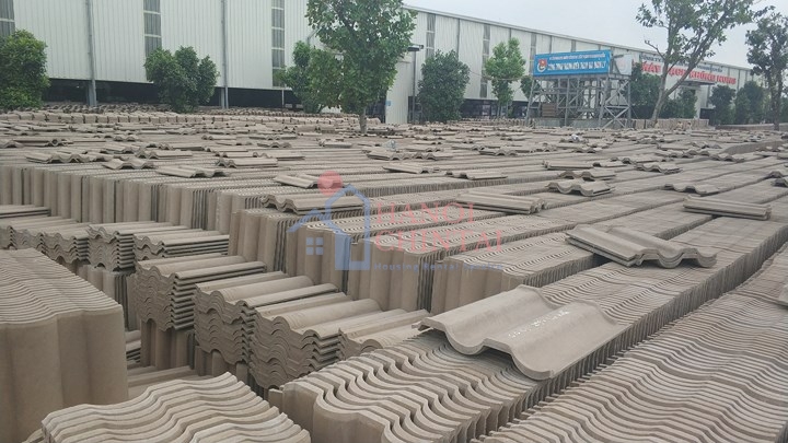 Ngói sóng không nung sau khi được ép từ tro xỉ than kết hợp với một số phụ liệu khác được xếp lô để chờ đến quy trình sơn màu.