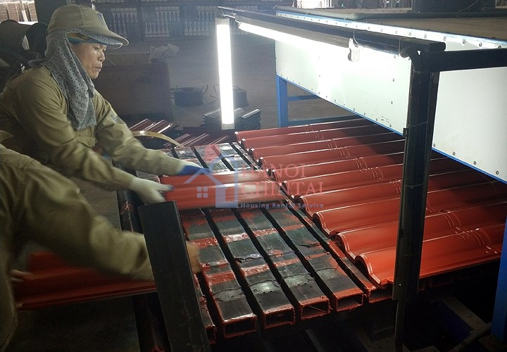 Ngói sóng sau khi sơn góc cạnh được đưa qua dây chuyền sơn phủ bề mặt với độ bền cao, chịu được tác động của thời tiết.