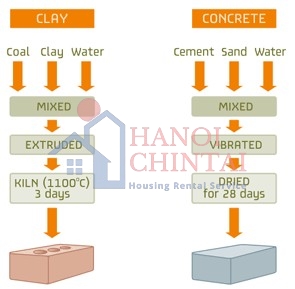 | Sự co rút, giãn nỡ | Gạch đất sét có xu hướng giãn nở rất ít sau khi sản xuất trong vài năm đầu tiên sử dụng, nhưng rất nhỏ chừng từ 3mm đến 5mm trong hơn 10 m chiều dài của bức tường | Gạch bê tông có xu hướng co lại một lượng và cũng rất nhỏ, thường là trong thời gian 6 tháng đầu tiên sau khi xây dựng |