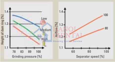 Tỉ lệ giữa tốc độ dòng khí và tốc độ phân ly cũng ảnh hưởng đến phân bố cỡ hạt. Một tốc độ dòng khí thấp hơn sẽ dẫn đến độ nghiêng của đường cong phân bố cỡ hạt thấp hơn. Bằng phương pháp này có thể đạt được phân bố cỡ hạt để nghiền xi măng trong máy nghiền OK tương tự như nghiền trong máy nghiền bi (hình 6). Tuy nhiên, cần phải chú ý rằng vận hành nhằm đạt được một phân bố cỡ hạt thích hợp phải có chi phí. Các phương pháp này được thực hiện nhằm đạt đợc độ nghiêng của đường cong phân bố cỡ hạt thấp. ví dụ một vành chặn cao, áp suất nghiền cao với tốc độ cấp liệu không thay đổi và tốc độ dòng khí thấp, tất cả những điều này dẫn đến hiệu quả nghiền thấp hơn và do đó dẫn đến tiêu thụ năng lượng cụ thể cao hơn.....