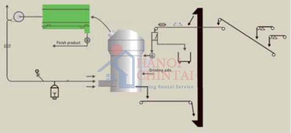 Để đảm bảo tính mất nước của thạch cao phù hợp, sơ đồ tổng quan hệ thống một máy nghiền con lăn đứng (hình 7) có tính đến sự hồi lưu khí thải nóng của máy nghiền tới đầu vào để duy trì nhiệt độ thích hợp trong chu trình nghiền. Nếu clinker lạnh hoặc phụ gia ẩm ướt thì có thể gia nhiệt thêm cho máy nghiền bằng hệ thống lò đốt phụ. Nếu nhiệt độ clinker cấp vào máy nghiền rất cao, một van khí lạnh tại đầu vào máy nghiền hoặc trong trường hợp nhiệt độ quá lớn có thể phun nước vào máy nghiền dể kiểm soát nhiệt độ đầu ra máy nghiền.