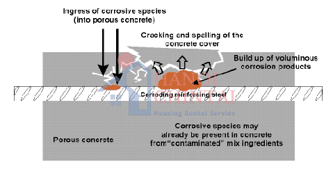 Quá trình ăn mòn bắt đầu khi gỉ thép xuất hiện và phát triển trên bề mặt cốt thép và gây nứt tại những vị trí tiếp giáp với bê tông. Sự phát triển của vết nứt phát triển dần dưới sự tấn công của các tác nhân ăn mòn cho đến khi phá vỡ hoàn toàn sự kết dính giữa bê tông và cốt thép (spalling) như hình minh hoạ trên.