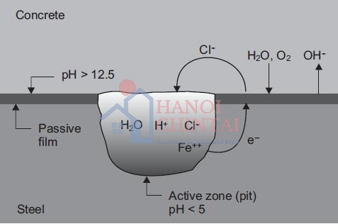 Ăn mòn cục bộ do sự tập trung của ion Cl- trên bề mặt cốt thép trong BTCT. Có bốn cơ chế xâm nhập của ion clorua qua lớp bảo vệ bê tông: