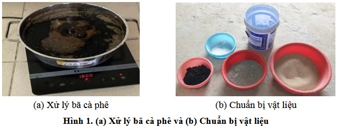 Sau khi để nguội, hỗn hợp bã cà phê được đổ qua sàng mắt lưới 0,15 mm cho ráo nước rồi sử dụng để trộn luôn. Như vậy bã cà phê được sử dụng trong nghiên cứu này ở trạng thái bão hòa nước. Nguyên nhân là bã cà phê có độ rỗng lớn, độ hút nước cao [6,7,11-13], nếu sử dụng ở điều kiện khô sẽ phải bổ sung lượng lớn nước để bù lại lượng nước bị hấp thụ làm thay đổi tỷ lệ nước/chất kết dính. Các loại vật liệu được chuẩn bị sẵn trước khi trộn như Hình 1b. Phụ gia siêu dẻo là loại Sikamen NN có tác dụng giảm nước, có khối lượng riêng là 1,15 T/m3. Nước máy được dùng để trộn mẫu, trộn cùng phụ gia siêu dẻo trước khi cho vào máy trộn.