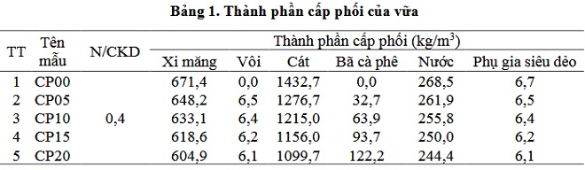 Thành phần cấp phối của các mẫu vữa được trình bày trong Bảng 1. Các mẫu vữa trong nghiên cứu được thiết kế với tỷ lệ nước/chất kết dính bằng 0,4. Mẫu đối chứng CP00 được thiết kế với thành phần gồm: xi măng, cát, nước và phụ gia siêu dẻo. Hàm lượng phụ gia siêu dẻo được xác định dựa trên thực nghiệm để độ chảy xòe của mẫu đạt trong khoảng 155÷185 mm, đáp ứng theo TCVN 4314-2022 [16]. Các mẫu còn lại chứa bã cà phê có sử dụng thêm vôi bột sống trong thành phần chất kết dính với hàm lượng là 1% (theo khối lượng) tổng hàm lượng chất kết dính.