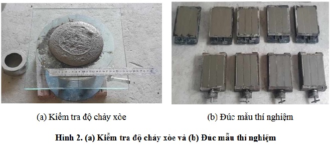 Các hỗn hợp vữa được chuẩn bị theo thành phần như Bảng 1, được tính toán khối lượng phù hợp cho 01 mẻ trộn. Ban đầu cho các vật liệu khô vào trộn đều trước, sau đó cho hỗn hợp nước và phụ gia siêu dẻo vào trộn đến khi đạt độ đồng nhất và đạt độ linh động như yêu cầu trên. Các tính chất của vữa được nghiên cứu bao gồm khối lượng đơn vị thể tích, cường độ chịu nén, cường độ chịu uốn được xác định theo TCVN 3121-2022 [19], vận tốc truyền xung siêu âm được xác định theo ASTM C597 [20], và độ truyền nhiệt được xác định bằng thiết bị chuyên dụng ISOMET 2114. Hình 2a thể hiện thí nghiệm kiểm tra độ chảy xòe của hỗn hợp vữa tươi.