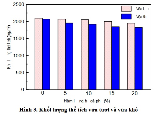 Nhìn chung, khối lượng thể tích vữa khô giảm so với khối lượng thể tích vữa tươi, điều này là do lượng nước thừa không phản ứng hết trong quá trình thủy hóa bay hơi, làm giảm khối lượng của vữa. Mặt khác, khi tăng hàm lượng bã cà phê thay thế cát, khối lượng thể tích vữa tươi và vữa khô đều giảm. Điều này là do khối lượng riêng của bã cà phê đã qua sử dụng (0,9 T/m3) nhỏ hơn so với khối lượng riêng của cát (2,62 T/m3).
