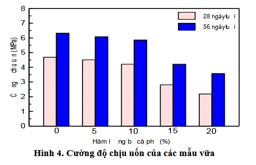 Tại 56 ngày tuổi, cường độ chịu uốn của mẫu đối chứng là 6,3 MPa, trong khi các mẫu khác có cường độ chịu uốn là 6,1 MPa, 5,9 MPa, 4,2 MPa và 3,6 MPa tương ứng với hàm lượng bã cà phê là 5%, 10%, 15% và 20%. Nguyên nhân dẫn đến sự suy giảm cường độ chịu uốn là do bã cà phê có cấu trúc hạt rỗng nên làm gia tăng thể tích rỗng, làm cho các thành phần vật liệu bên trong mẫu kém liên kết bền vững với nhau. Thêm vào đó, có thể còn tồn tại một lượng tạp chất (đường, sữa, …) trong bã cà phê, các tạp chất này làm chậm phản ứng thủy hóa của xi măng, dẫn đến cường độ chịu uốn của các mẫu vữa chứa bã cà phê giảm.
