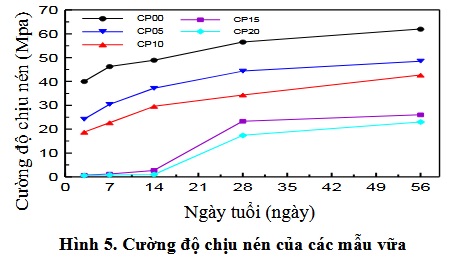 Cường độ chịu nén của các mẫu vữa chứa bã cà phê đã qua sử dụng và mẫu đối chứng được thể hiện trên Hình 5. Kết quả nghiên cứu cho thấy cường độ chịu nén của các mẫu vữa phát triển tăng dần theo thời gian. Mẫu đối chứng CP00 có cường độ chịu nén tăng từ 40 MPa ở 3 ngày tuổi lên 62 MPa ở 56 ngày tuổi. Tương tự, mẫu CP05 có cường độ chịu nén tăng từ 24,2 MPa lên 48,6 MPa, mẫu CP10 có cường độ chịu nén tăng từ 18,8 MPa lên 42,7 MPa ở 56 ngày tuổi, mẫu CP15 có cường độ chịu nén tăng từ 0,7 MPa lên 26 MPa, và mẫu CP20 có cường độ chịu nén cũng tăng từ 0,6 MPa lên 23 MPa.