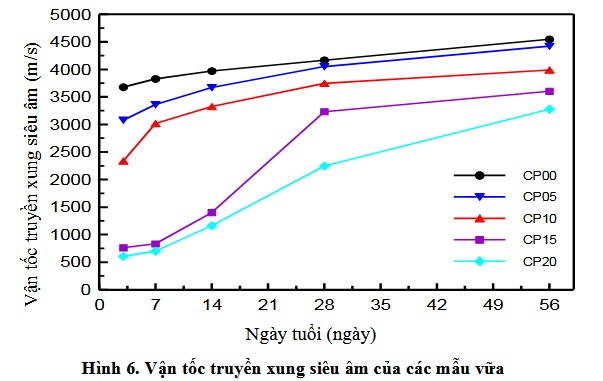 Tại 56 ngày tuổi, giá trị vận tốc truyền xung siêu âm của mẫu đối chứng là 4545 m/s, trong khi các mẫu sử dụng 5%, 10%, 15% và 20% bã cà phê có giá trị vận tốc truyền xung siêu âm tương ứng là 4420 m/s, 3990 m/s, 3604 m/s và 3279 m/s. Theo phân loại chất lượng vữa của Pacheco-Torgal và các cộng sự [21], các mẫu vữa sử dụng bã cà phê trong nghiên cứu này có giá trị vận tốc truyền xung siêu âm trong khoảng 3000 ÷ 4500 m/s được xếp vào loại có chất lượng đảm bảo theo yêu cầu kỹ thuật. Có nghĩa là, nếu dựa vào cường độ chịu nén và giá trị vận tốc truyền xung siêu âm như đã trình bày ở trên, có thể sử dụng bã cà phê đã qua sử dụng với hàm lượng lên tới 20% trong sản xuất vữa xây dựng.