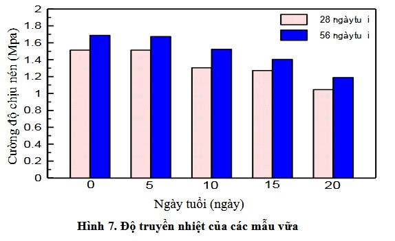 Độ truyền nhiệt của các mẫu vữa tại 28 và 56 ngày tuổi được thể hiện trên Hình 7. Ở 28 ngày tuổi, mẫu đối chứng CP00 có độ truyền nhiệt lớn nhất, đạt 1,513 W/m.K, trong khi mẫu vữa chứa 20% bã cà phê có độ truyền nhiệt nhỏ nhất là 0,957 W/m.K. Đến 56 ngày tuổi, độ truyền nhiệt của các mẫu vữa đều có xu hướng tăng nhẹ so với độ truyền nhiệt của các mẫu ở 28 ngày tuổi, đạt giá trị tương ứng là 1,674; 1,525; 1,404; 1,19 và 1,16 W/m.k tương ứng với các mẫu chứa 0%, 5%, 10%, 15% và 20% bã cà phê đã qua sử dụng. Ở cùng ngày tuổi, giá trị độ truyền nhiệt giảm dần khi tăng hàm lượng bã cà phê trong thành phần cấp phối. Hiện tượng này là do bã cà phê có độ rỗng lớn như đã được trình bày ở trên, các liên kết trong các mẫu vữa chứa bã cà phê yếu và có độ xốp, vì vậy khi hàm lượng bã cà phê đã qua sử dụng trong mẫu vữa càng lớn thì độ truyền nhiệt của mẫu càng giảm, có nghĩa là khả năng cách nhiệt của các mẫu vữa tăng.