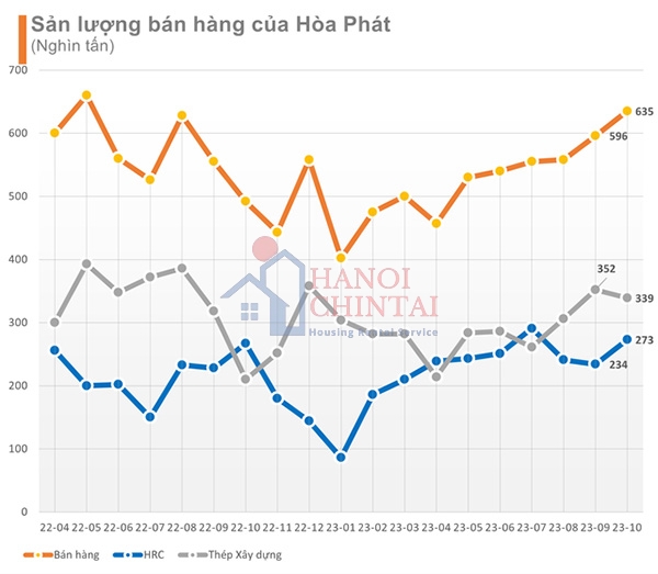 Trong tháng 10 vừa qua, Tập đoàn Hòa Phát (mã chứng khoán: HPG) sản xuất 619.000 tấn thép thô, giảm 3% so với tháng trước. Sản lượng bán hàng các sản phẩm thép cuộn cán nóng (HRC), thép xây dựng, phôi thép đạt 635.000 tấn, tăng 29% so với cùng kỳ năm trước và cũng là mức cao nhất kể từ tháng 6/2022.