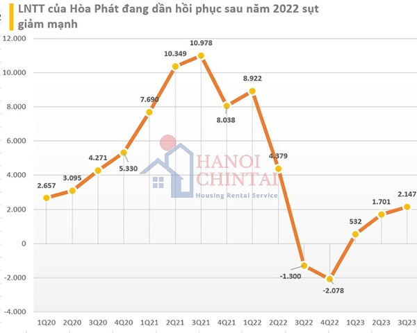 Lũy kế 9 tháng đầu năm 2023, Hòa Phát ghi nhận 85.430 tỷ đồng doanh thu và lợi nhuận sau thuế đạt 3.830 tỷ đồng, lần lượt giảm 27% và 63% so với cùng kỳ năm trước. So với kế hoạch năm 2023, Hòa Phát đã hoàn thành được 48% chỉ tiêu về lợi nhuận.