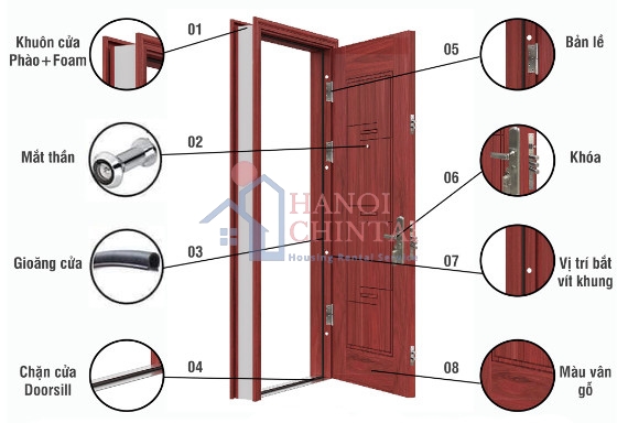 • Cánh cửa: Có độ dày khoảng 50mm, thép cánh dày 0.8mm với cấu tạo 3 lớp. 2 lớp ngoài là thép mạ điện nguyên tấm. Bên trong là vật liệu giấy tổ ong (honeycomb paper) làm tăng khả năng cách âm, cách nhiệt của cửa.