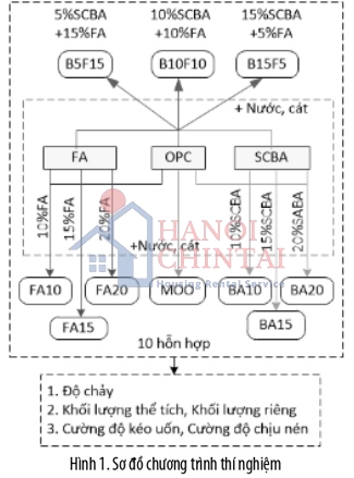 Ảnh hưởng của FA đến tính chất của hỗn hợp vữa khá rõ ràng nhưng với SCBA phụ thuộc vào nhiều yếu tố. Nhìn chung, SCBA làm tăng cường độ và độ bền của vữa khi được xử lý công phu. Tuy nhiên, đây là rào cản khi xem xét ở góc độ tiết kiệm năng lượng. Nghiên cứu này khảo sát đặc tính kỹ thuật của vữa 3 thành phần: xi măng, FA và SCBA với các đặc trưng vật liệu được xác định khi thu thập FA và SCBA từ các nhà máy nhiệt điện. SCBA được xử lý đơn giản, ít tiêu hao năng lượng. Nghiên cứu kỳ vọng bước đầu đánh giá khả năng kết hợp giữa FA và SCBA thông qua tính chất vữa. Kết quả là cơ sở để có những nghiên cứu tiếp theo. Nghiên cứu thực hiện tại phòng thí nghiệm công trình, Trường Đại học Tôn Đức Thắng, TP.HCM Sơ đồ nghiên cứu thể hiện ở Hình 1.