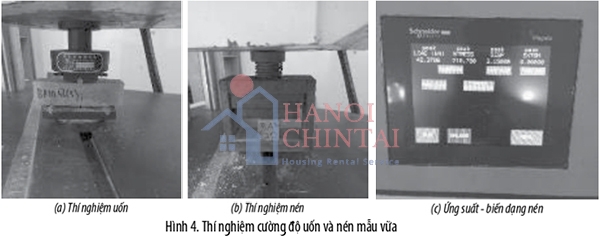 Thí nghiệm cường độ theo ASTM C3480-01 [23] ở các ngày 7, 14,28, 56 và 112 bằng máy đa năng UTest Universal Machine có giới hạn 2000kN. Mẫu vữa kích thước 40x 40x 160 (mm³) được uốn với tốc độ 10N/s. Kết quả là giá trị trung bình của 3 mẫu. Cường độ kéo uốn được tính theo công thức (1):