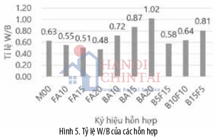 Tỷ lệ W/B của hỗn hợp vữa thể hiện ở Hình 5. Lượng nước yêu cầu giảm cho hỗn hợp chứa FA và tăng mạnh với SCBA. Tỷ lệ W/B của M00 bằng 0,63. Khi thay thế xi măng bằng 10%, 15% và 20% khối lượng FA, tỷ lệ này lần lượt là 0,55; 0,51 và 0,48. Đối với SCBA là 0,72, 0,78 và 1,02. Hỗn hợp vữa chứa ba thành phần chất kết dính có lượng nước yêu cầu trung bình 0,68 và cao hơn M00 một ít. FA dạng cầu, trơn nhẵn giảm ma sát giữa các hạt cốt liệu làm tăng tính công tác cho hỗn hợp [11]. SCBA xốp, rỗng hấp thụ nước, dẫn đến yêu cầu lượng nước cao khi trộn [19].