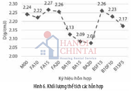 Khối lượng thể tích của các hỗn hợp thể hiện ở Hình 6. Hỗn hợp chứa FA có khối lượng thể tích 2,25 (g/cm³) tương đương với M00 là 2,24 (g/cm³), phù hợp với nghiên cứu [9], khối lượng thể tích giảm 1,3% khi thay thế 50% xi măng. Khối lượng thể tích của hỗn hợp chứa là SCBA 2,13 (g/cm³), 2,09 (g/cm³) và 2,08 (g/cm³) với tỉ lệ thay thế 10%, 15% và 20%, giảm 5,1%, 6,9% và 7,4%. SCBA nhẹ và xốp làm tăng lượng nước trong hỗn hợp, lượng nước dư bay hơi làm khối lượng thể tích giảm xuống [19]. Vữa ba thành phần có khối lượng thể tích 2,22 (g/cm³). Hạt FA nhỏ và tròn đã lấp đầy lỗ rỗng của SCBA, làm tăng độ đặc, khối lượng thể tích thay đổi không đáng kể.